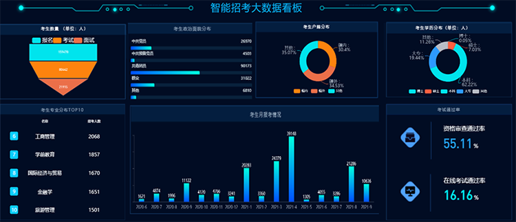 数据分析看板,智能报表,支持区域主管部门及用人单位及时、便利掌握考试数据和人才分布。